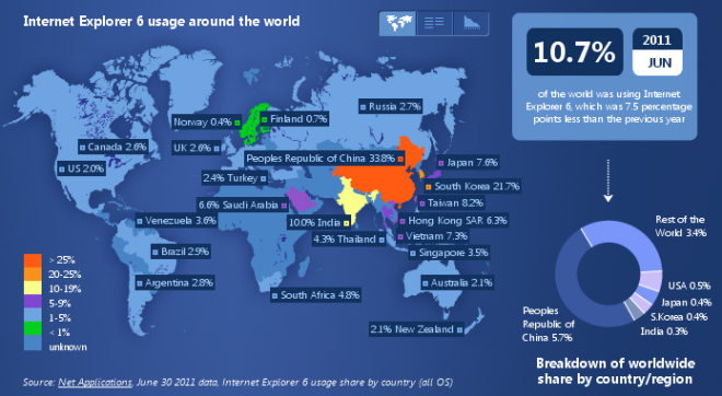 Currently China has the most number of users of IE6 with 33.8% of Chinese users uses IE6 followed by India with 10%. Only 4 countries have been able to reduce the usage of IE6 below 1% mark which are Sweden, Denmark, Finland and Norway.